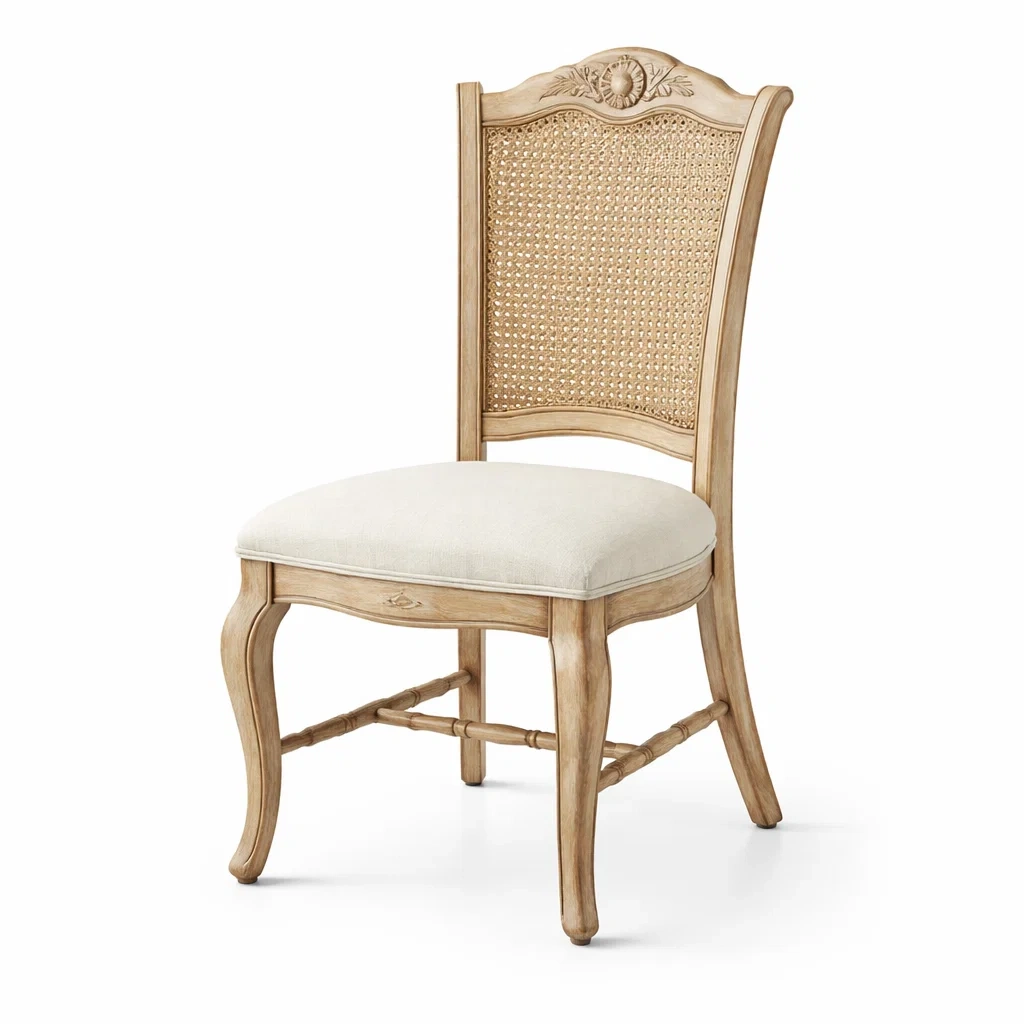Sedia da pranzo in legno con seduta in lino e schienale in paglia intrecciata