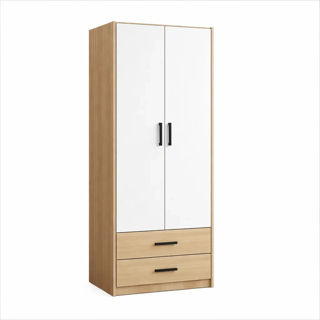 Armadio realizzato in pannelli di fibra a media densità (MDF) con finitura bianca e naturale.