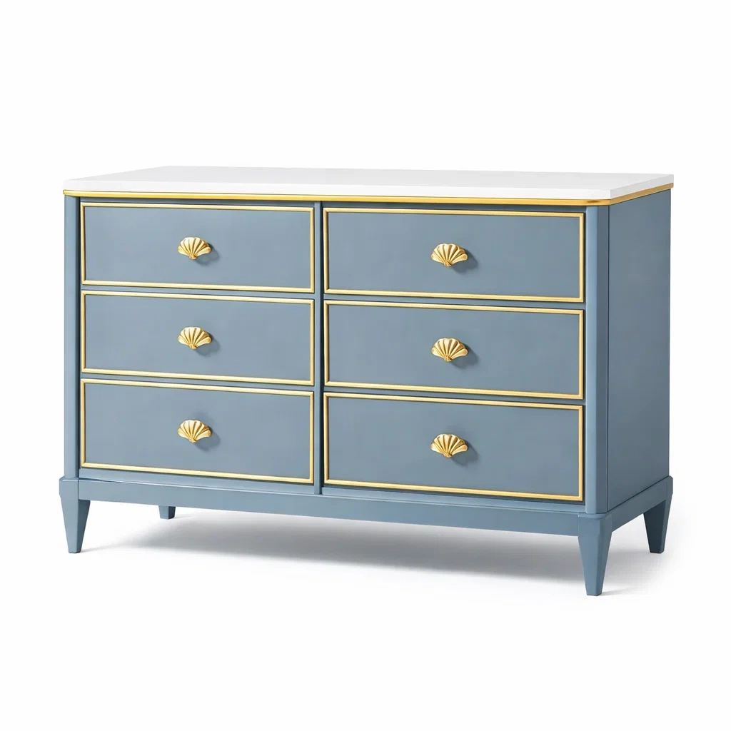 La cassettiera è realizzata in legno massiccio con maniglie in metallo. Presenta sei cassetti spaziosi per una conservazione pratica e organizzata. Il colore Blu con dettagli Dorati aggiunge un tocco distintivo. Ogni cassetto è decorato con profili dorati e maniglie a forma di conchiglia. Le gambe coniche offrono stabilità.