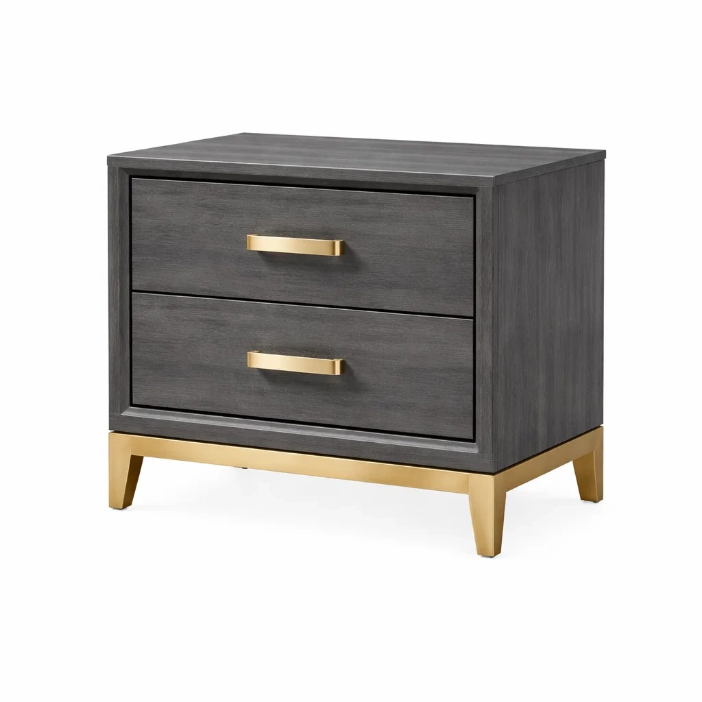 Comodino con struttura in legno MDF e base in metallo con due cassetti per riporre oggetti personali.