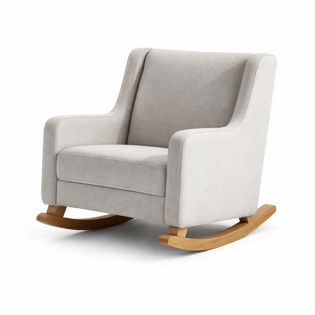 La poltrona a dondolo presenta una struttura in legno massello di quercia e rivestimento in tessuto di poliestere grigio chiaro. L'imbottitura è in schiuma ad alta densità. Le dimensioni sono 75 cm di lunghezza, 80 cm di larghezza e 90 cm di altezza. La capacità di carico è di 120 kg. Progettata per uso interno.
