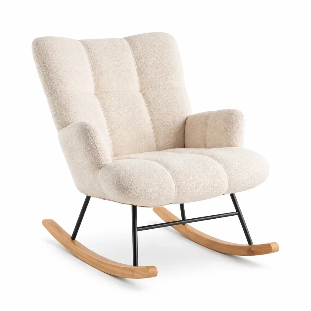 Questa poltrona a dondolo presenta un rivestimento in tessuto bouclé beige, con struttura in metallo e basamenti in legno massello. La seduta ha un'imbottitura in schiuma ad alta densità.
