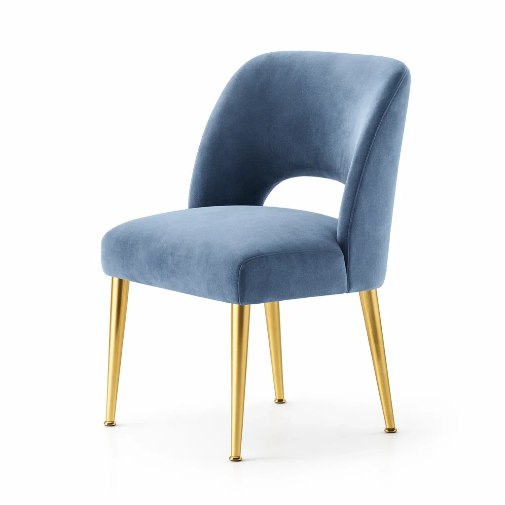 Questa sedia presenta una struttura solida con gambe in metallo dorato, combinata con una seduta imbottita in velluto blu. L'imbottitura utilizza schiuma ad alta densità per un comfort ottimale. Le dimensioni sono altezza 90 cm, larghezza 50 cm e profondità 45 cm. Peso totale: 7.5 kg.
