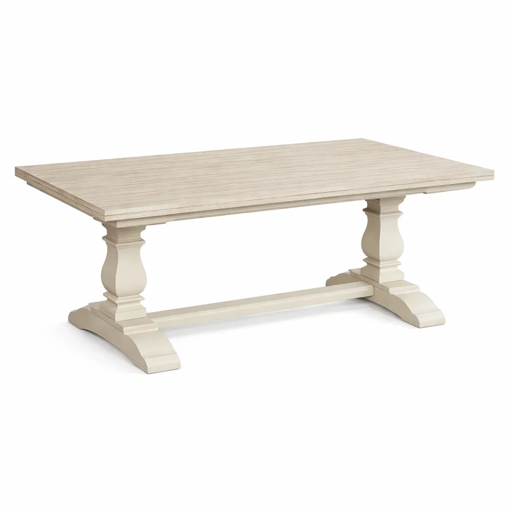 Il tavolo da pranzo rettangolare è realizzato in legno con una finitura verniciata.